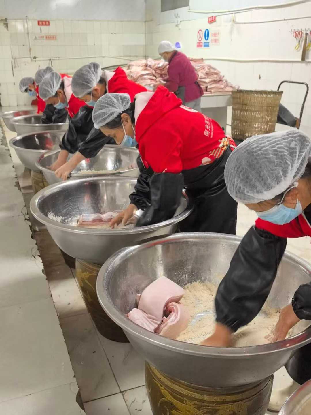 做藏香黑豬臘肉,我們還是守著老規(guī)矩來!精選豬五花、后腿肉這些好部位,用自貢井鹽搭配本地花椒、桂皮手工揉腌,腌夠7天再翻一次身,確保每一寸肉都吸滿香料味。之后掛起來曬足山風日曬,最后進烘房用松柏、橘皮文火慢熏20多個小時,沒有任何添加劑,全靠時間和手藝沉淀出醇厚臘香。